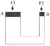 그림의 유압장치에서 A부분 실린더 단면적 200cm2, B부분 실린더 단면적이 50cm2일 때 F2에 작용하는 힘이 1,000N이면 F1에는 몇 N의 힘이 작용하는가?
