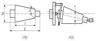 (가)와 같이 테이퍼진 공작물을 선반가공으로 만들기 위해서 (나)와 같이 심압대를 편위할 때, 심압대 편위량(e)은?