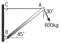 그림과 같이 600kg의 힘이 A점에 작용하고 있다. 케이블 AC와 강봉 AB에 작용하는 힘의 크기는?