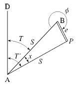 삼각점 A에 기계를 세웠을 때, 삼각점 B가 보이지 않아 P를 관측하여 T′=65°42′39″의 결과를 얻었다면 T=∠DAB는? (단, S=2km, e=40cm,ø=256°40′)