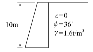 다음 그림과 같은 높이가 10m인 옹벽이 점착력이 0인 건조한 모래를 지지하고 있다. 모래의 마찰각이 36°, 단위중량이 1.6t/m3일 때 전 주동토압은?