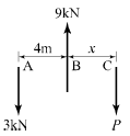 그림과 같은 세 개의 힘이 평형상태에 있다면 C점에서 작용하는 힘 P와 BC사이의 거리 x는?