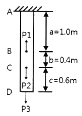균질한 균일 단면봉이 그림과 같이 P1, P2, P3의 하중을 B, C, D점에서 받고 있다. 각 구간의 거리 a=1.0m, b=0.4m, c=0.6m이고 P2=100kN, P3=50kN의 하중이 작용할 때 D점에서의 수직방향 변위가 일어나지 않기 위한 하중 P1은 얼마인가?