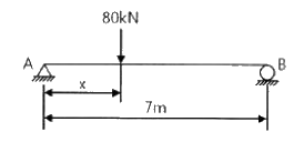 그림과 같은 단순보에서 B점의 수직반력 RB가 50kN까지의 힘을 받을 수 있다면 하중 80kN은 A점에서 몇 m까지 이동할 수 있는가?
