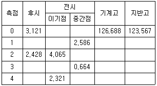 어떤 노선을 수준측량한 결과가 표와 같을 때, 측점 1, 2, 3, 4의 지반고 값으로 틀린 것은? (단위 : m)