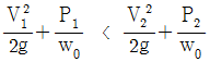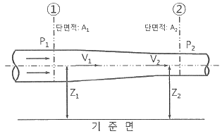 그림에서 단면 ①, ②에서의 단면적, 평균유속, 압력강도를 각각 A1, V1, P1, A2, V2, P2 라 하고, 물의 단위 중량을 w0 라 할 때, 다음 중 옳지 않은 것은? (단, Z1 = Z2 이다.)
