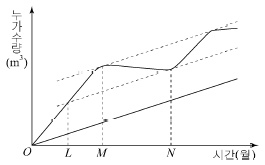 급수용 저수지의 유효저수량을 결정하기 위한 Ripple 곡선이다. 다음 중 저수지의 수위가 가장 높아지는 때는?