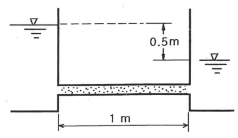 2개의 수조를 연결하는 길이 1m의 수평관속에 모래가 가득 차 있다. 양수조의 수위하는 0.5m이고 투수계수가 0.01cm/s이면 모래를 통과할 때의 평균유속은?