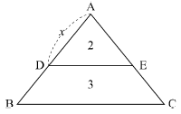 그림과 같이 ΔABC의 토지를 한 변 BC에 평행한 DE 로 분할하여 면적의 비율이 ΔADE:□BCED=2:3이 되게 하려고 한다면 AD의 길이는? (단, AB의 길이는 50m)