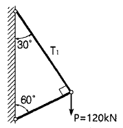P=120kN의 무게를 매달은 그림과 같은 구조물에서 T1이 받는 힘은?