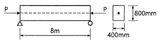 그림과 같은 경간 8m인 직사각형 단순보에 등분포하중(자중포함) w=30kN/m가 작용하며 PS 강재는 단면 도심에 배치되어 있다. 부재의 연단에 인장응력이 발생하지 않게하려 할 때, PS 강재에 도입되어야할 최소한 긴장력(P)은?