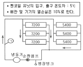 다음 그림과 같은 냉수 배관계통에서 ㉠점의 냉수 순환량은? (단, 펜코일 유닛의 단위는 와트(W)이며, 물의 비열은 4.2kJ/kg∙K, 물의밀도는 1kg/L이다.)