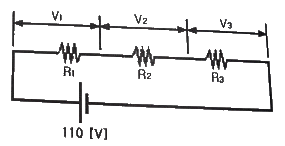 다음 직렬회로에서 R1=2[Ω], R2=3[Ω], R3=5[Ω] 이고 V=110[V]일 때 V2의 값은?