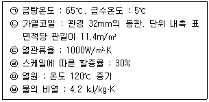 다음과 같은 조건에서 어느 건물의 시간 최대 예상급탕량이 4000L/h 일 때, 저탕조 내의 가열코일의 길이는?