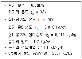 다음과 같은 조건에서 실체적 3000m3 인 어떤 실의 틈새바람에 의한 냉방부하는?