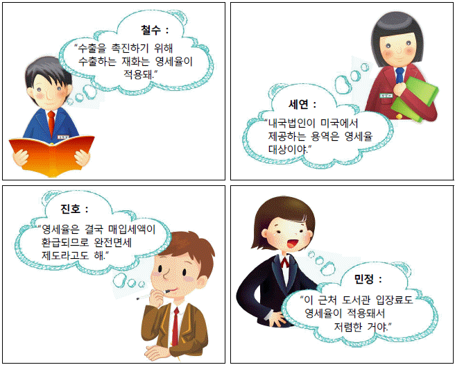 다음 중 부가가치세법상 영세율에 대하여 잘못 알고 있는 친구는 누구인가?