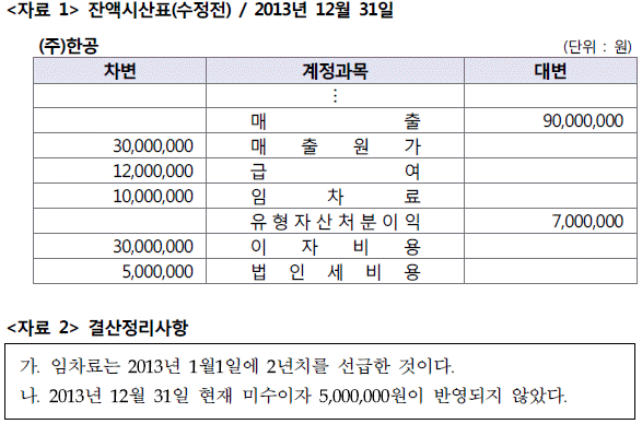 다음은 (주)한공의 2013년 12월 31일 수정전 잔액시산표 중 손익계산서 관련 계정 내역과 결산정리사항을 나타낸 것이다. 결산정리사항을 반영한 후, 2013년 당기순이익은 얼마인가?