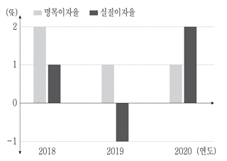 갑국의 연도별 명목이자율과 실질이자율이 그림과 같이 나타났다. 이에 대한 설명으로 옳은 것은?