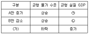 표는 총수요나 총공급의 변동이 국민 경제 균형에 미치는 영향을 나타낸다. 이에 대한 설명으로 옳은 것은? (단, 총수요 곡선은 우하향하며 총공급 곡선은 우상향한다. 또한 A, B는 총수요, 총공급 중 하나이다)