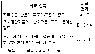 자료수집 방법 A~C에 대한 설명으로 가장 적절한 것은? (단, A~C는 질문지법, 참여관찰법, 문헌연구법 중 하나이다)