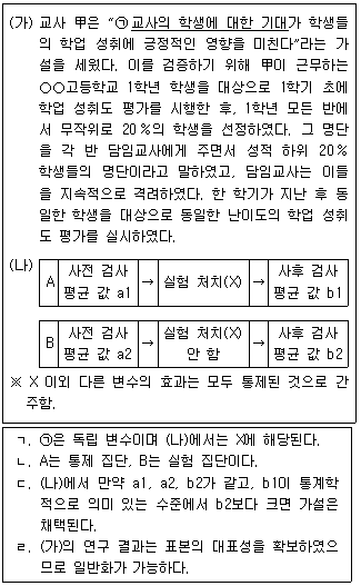 교사 甲은 (가)의 연구를 일반적인 실험 설계 형태인 (나)로 재구성하였다. 이에 대한 설명으로 옳은 것만을 보기에서 모두 고른 것은?