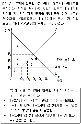 다음 자료에 대한 분석으로 보기에서 옳은 것만을 모두 고르면? (단, a~j는 각 영역의 면적에 해당하며, 갑국은 X재만을 거래한다)