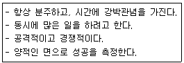 개인의 성격을 건강과 관련하여 연구하는 성격 유형 중 아래와 같은 행동 양식을 가지는 유형으로 옳은 것은?