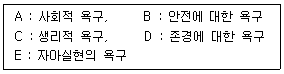 Maslow의 욕구단계 이론을 하위단계부터 상위단계로 올바르게 나열한 것은?