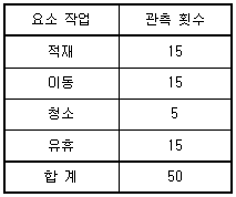 어느 회사가 외경법을 기준으로 10%의 여유율을 제공한다. 8시간 동안 한 작업자를 워크샘플링한 결과가 다음 표와 같다. 이 작업자의 수행도 평가 결과 110%였다. 청소 작업의 표준 시간은 약 얼마인가?