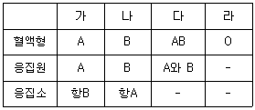 혈액형에 따른 응집원과 응집소를 나타낸 것으로 응집소가 잘못된 것은?