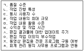 [보기] 중 전산편집 시스템을 구성하기 위해 점검하여야 할 사양 및 작업 요건으로만 나열된 것은?