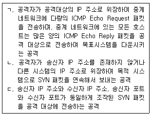 다음 설명에 해당하는 DoS 공격을 옳게 짝 지은 것은? (순서대로 ㄱ, ㄴ, ㄷ)