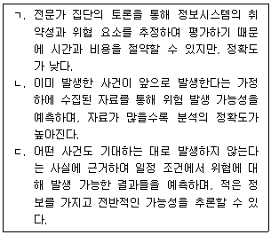 다음 설명에 해당하는 위험분석 및 평가 방법을 옳게 짝 지은 것은?(순서대로 ㄱ, ㄴ, ㄷ)