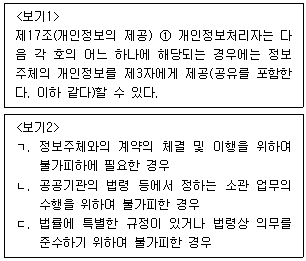 다음의 개인정보보호법 제17조 ①항에 따라 개인정보처리자가 정보주체의 개인정보를 수집한 목적범위 안에서 제3자에게 제공할 수 있는 경우로 <보기>에서 옳은 것만을 모두 고른 것은?