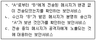 다음 문장은 송신자 “A”가 수신자 “B”에게 메시지를 보낼 때, 발생할 수 있는 보안 위협에 대응하는 보안기술을 설명한 것이다. 각각의 보안서비시로 알맞게 나타낸 것은?