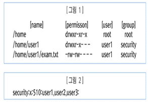 [그림1]은 어떤 리눅스 시스템에 존재하는 특정 /home 디렉터리와 그 아래에 존재하는 디렉터리 및 파일들의 속성 중 name, permission, user, group 등에 대한 정보만 요약한 것이며, [그림2]는 이 시스템에 존재하는 /etc/group 파일의 일부분이다. 이를 통하여 확인할 수 있는 파일 및 디렉터리의 permission에 관한 설명 중 올바르지 않은 것은?