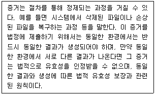 다음 문장에서 설명하고 있는 포렌식으로 획득한 증거의 법적인 효력 보장을 위한 5대 원칙은?