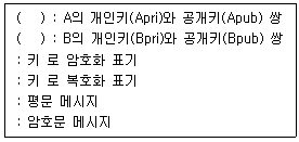 다음 지문에서와 같이 정의되었을 때, A가 B에게 메시지 M을 암호화 하여 보내고자 한다. 올바른 설명은?