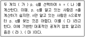 다음 지문은 공개키 암호방식에 대한 내용을 설명한 것이다. (가)~(마)에 들어가야 할 단어로 옳은 것은?