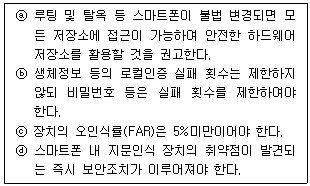 KISA에서 발표한 생체인식기반 간편 공인인증 가이드라인의 보안 요구사항으로 부적합한 사항들은?
