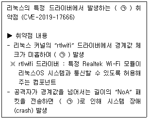 다음은 KISA의 리눅스 Wi-Fi 보안취약성에 대한 보안권고문 중 일부이다. 빈칸 ㉠에 공통적으로 들어갈 용어는?