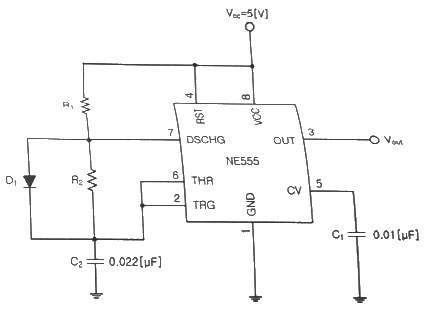 다음의 비안정 NE555회로에서 발진기의 출력(Vout) 듀티사이클 50[%] 미만으로 만들기 위한 조건으로 알맞은 것은?