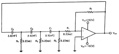 다음의 위상 이동 발진기 회로에서 발진이 지속적으로 유지하기 위한 Rf값과 발진기의 출력주파수(Vout)는 약 얼마인가?