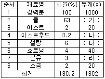 다음 표에 나타난 배합 비율을 이용하여 빵 반죽 1802g을 만들려고 한다. 다음 재료 중 계량된 무게가 틀린 것은?