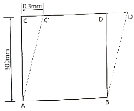 그림과 같은 직사각형 판의 AB면을 고정시키고 점 C를 수평으로 0.3mm 이동시켰을 때 측면 AC의 전단변형도는?