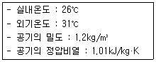 다음과 같은 조건에서 냉방시 외기 3000m3/h가 실내로 인입될 때 외기에 의한 현열 부하는?