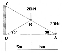 아래 그림과 같은 트러스에서 AB부재의 부재력의 크기는? (단, +는 인장, -는 압축임)