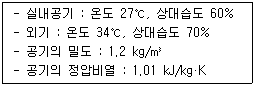 다음과 같은 조건에서 틈새바람 100m3/h 가 실내로 유입되었다. 이로 인해 발생하는 냉방현열부하는?
