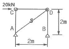그림과 같은 구조물의 C점에 20kN의 수평력이 작용할 때 S부재에 발생하는 응력의 값은?