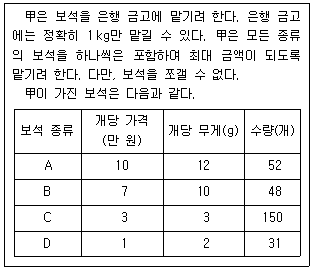 다음 글을 근거로 판단할 때, 甲이 은행 금고에 맡길 A의 개수는?